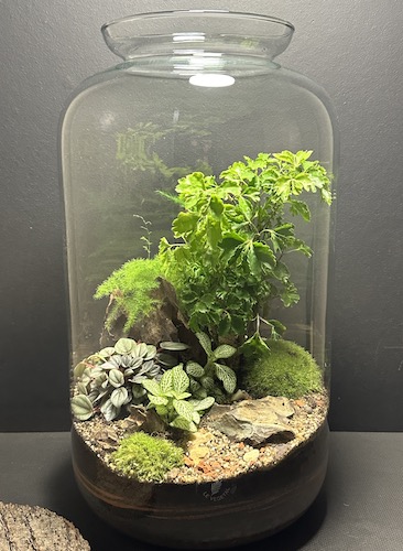 Matériaux : verre recyclé, couvercle liège, pouzzolane, sable quartz noir, sable noir, strate terra cotta, ohko stone, sable naturel, sable quartz brun, briquette rouge
