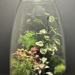Matériaux : verre recyclé, couvercle bois, sable quartz noir, sable noir, strate rouge/noir, seiryu stone, balsalte, ardoises plates, graviers, pierres de lave noire