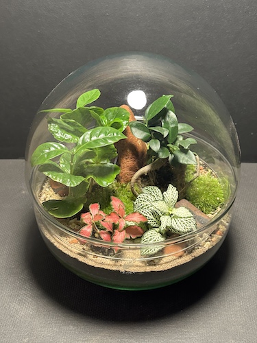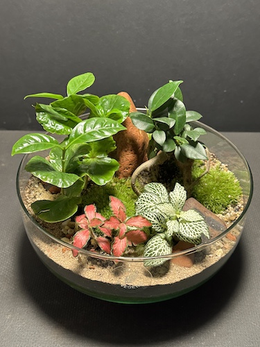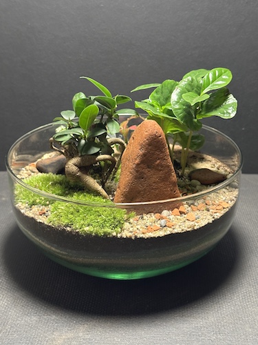 Plantes : mousses, Ficus Ginseng, Coffea Arabica, Fittonia rouge et blanc