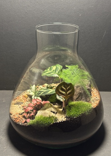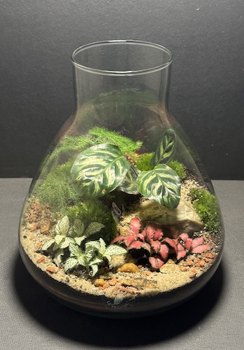 Plantes : mousses, Calathea Makoyana, Asparagus Plumosus, Fittonias rouge et blanc