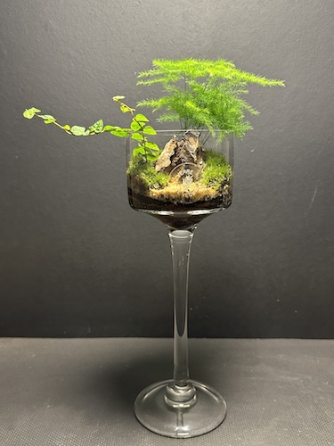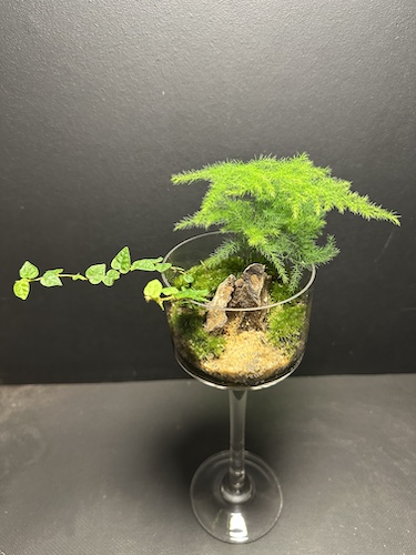 Matériaux : Terrarium ouvert, verre sur pied, pouzzolane, sable quart noir, sable quartz marron, sable noir, sable terra cotta, Ohko stone, sable naturel, briquette rouge
